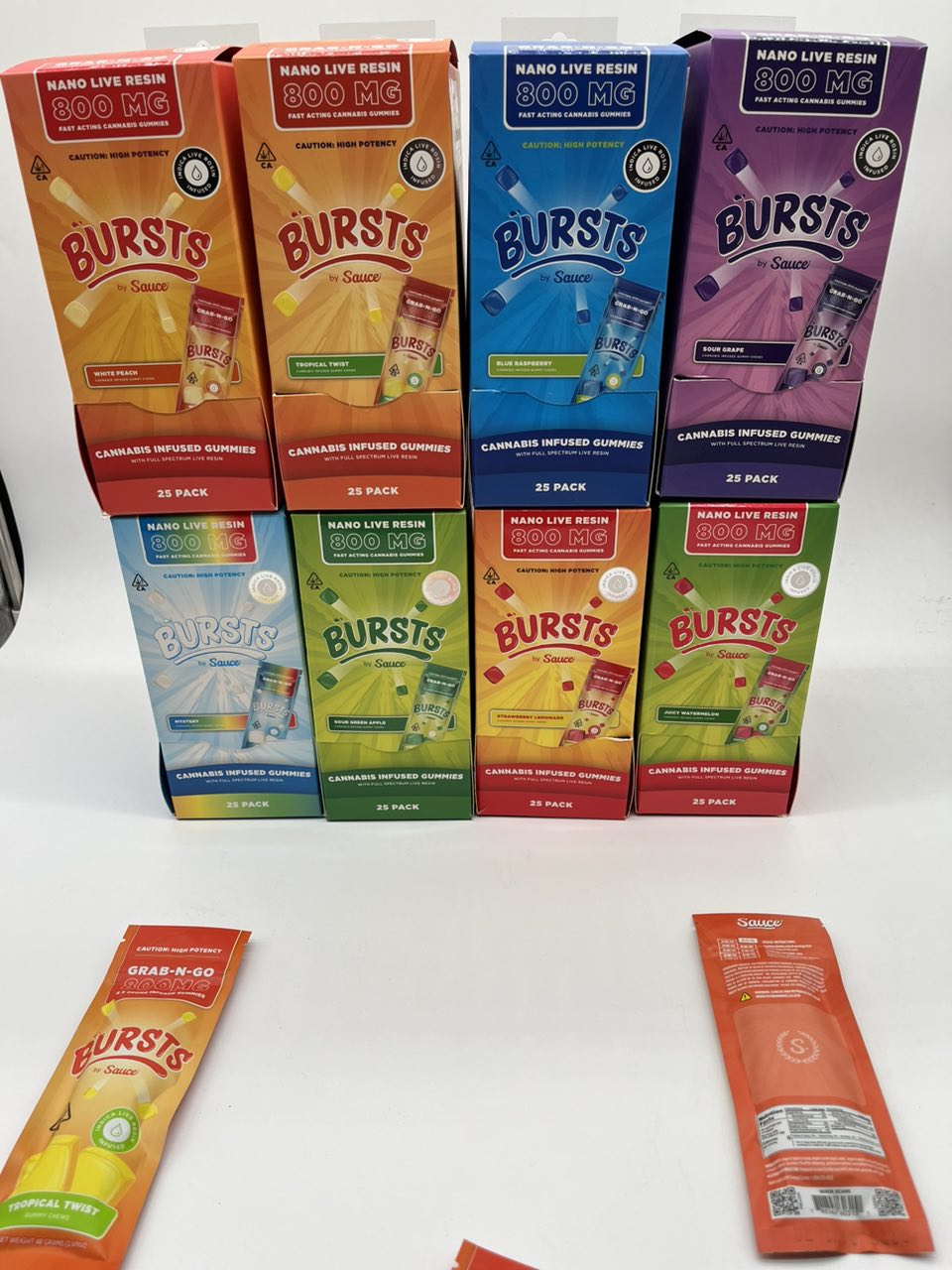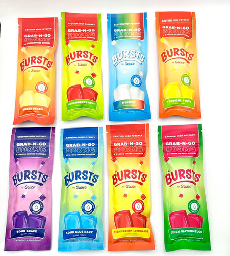 Bursts Sauce Gummies cannabis gummies are commonly used to treat poor appetite, pain, and weight loss in people who have cancer. Additionally, these products may reduce pain and muscle spasms, relieve nausea and vomiting, enhance sleep quality, and improves anxiety. These delicious edibles make for the perfect discreet treat. These treats pack a potent punch. Great to enjoy with friends on the go. Edible packages come with 4 pieces and each piece is 200mg. Whole bag contains 800mg. Gummies are infused with live resin.
